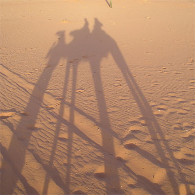 Schaduw van kameel, Wadi Rum, Jordanië.