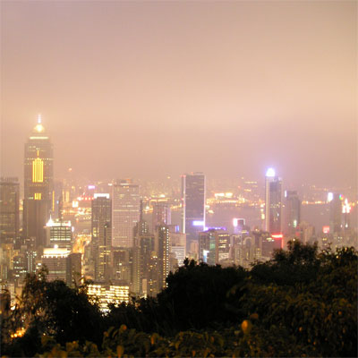 De skyline van Hongkong Island.