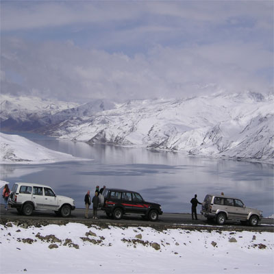 Toyota Landcruisers bij Yamdrokmeer, Tibet.
